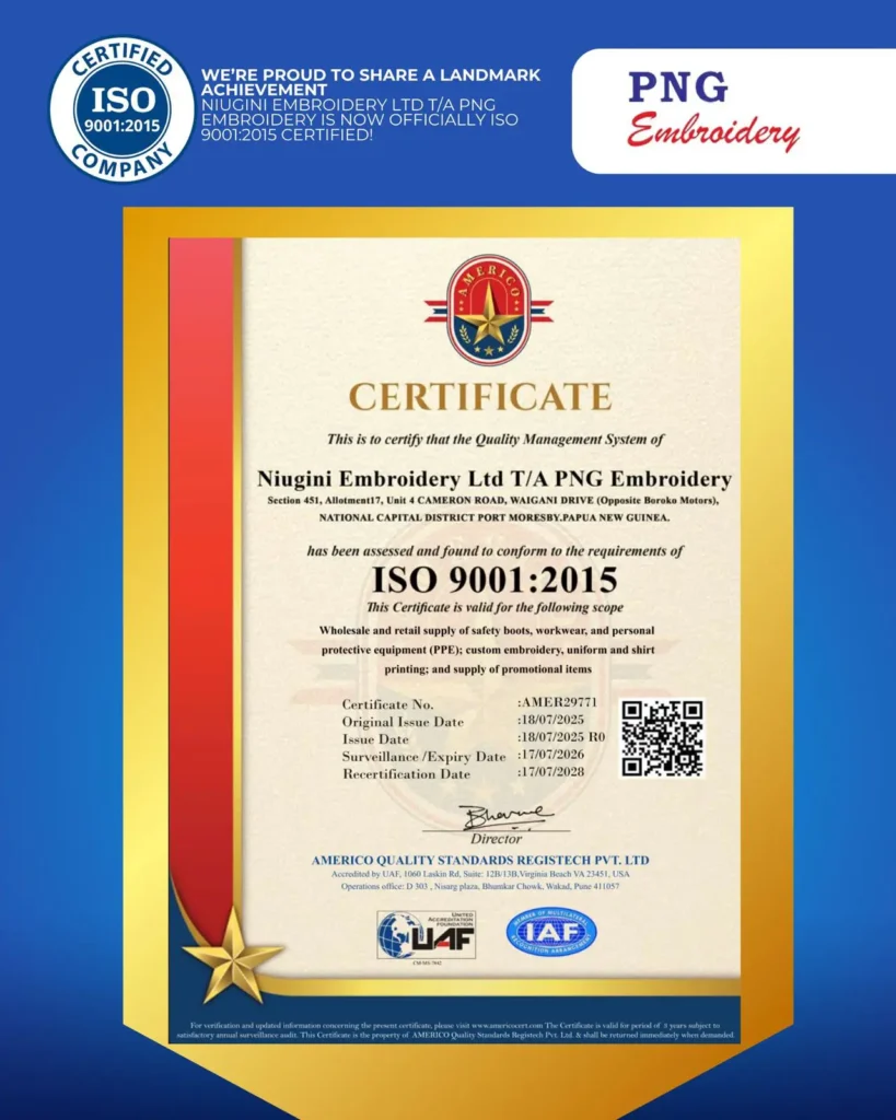 At PNG Embroidery, we combine ISO-9001 certified quality, in-house manufacturing, and fast turnaround times to deliver uniforms and promotional items that stand out. With decades of experience, modern facilities, and a passion for precision, we’re your one-stop partner for durable, customized, and professional apparel solutions across Papua New Guinea.